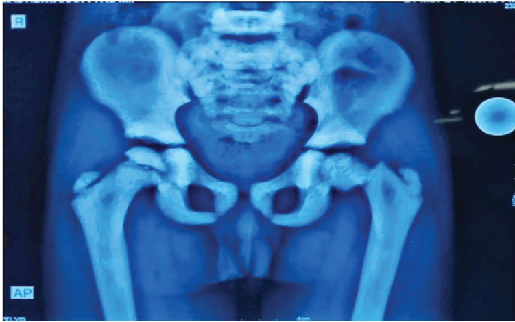 A 6-year-old boy presented to the emergency department with pain and inability to bear weight on the left lower limb following a trivial slip and fall. Clinical examination revealed restricted and painful movements of the left hip. Radiographs of the pelvis demonstrated a fracture of the left femoral neck with marked sclerosis of the pelvic bones and proximal femur, raising suspicion of a pathological fracture (Fig. 1).