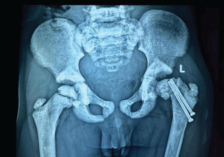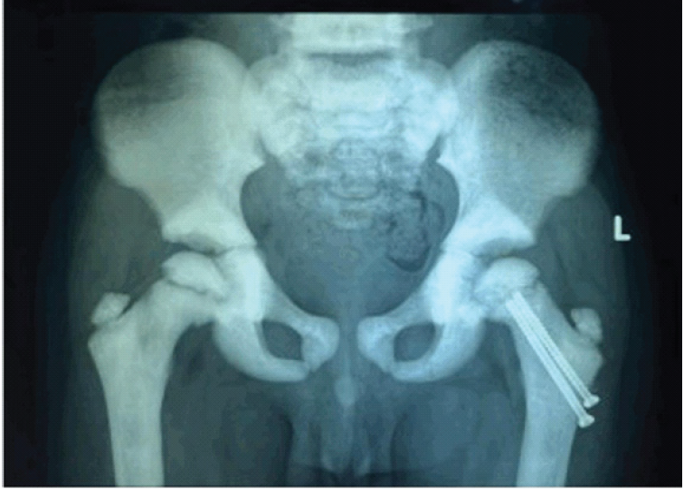 Conclusion: This case highlights the importance of fixation strategy in pathological pediatric femoral neck fractures and suggests that crossing the physis may be necessary to prevent late epiphyseal slippage.