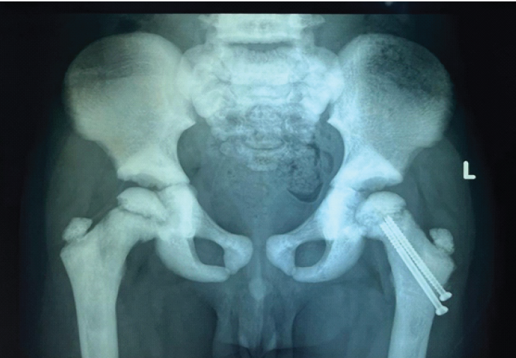 Postoperatively, a hip spica cast was applied for 7 weeks. After removal of the hip spica cast, gradual physiotherapy and progressive weight-bearing were initiated under clinical supervision. Follow-up radiographs after cast removal showed satisfactory fracture healing (Fig. 3).