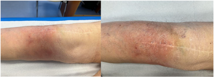 Figure 1: Images of the patient’s right knee. Hyperemia and moderate swelling can be observed around the distal region of the surgical scar.