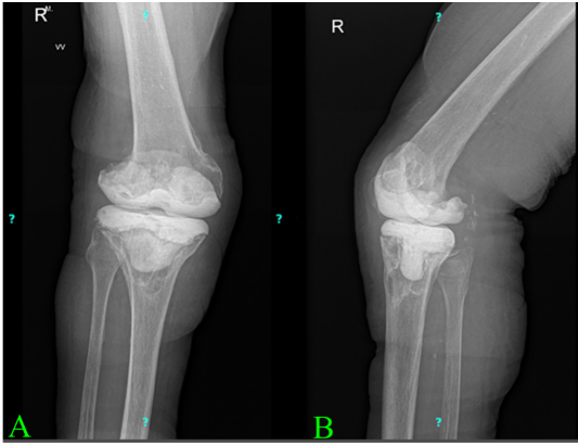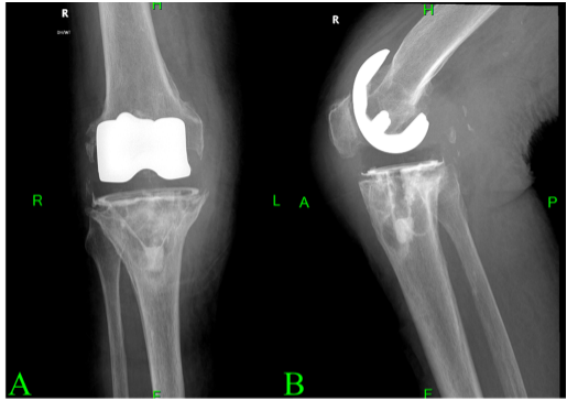 Figure 2: Prominent resorptive changes are observed of the femoral component. Lytic lesions are also noted along the tray of the tibial component. The image in panel A (a) shows an anteroposterior view, while panel B (b) presents a lateral view of the radiograph.