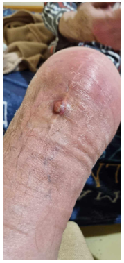 Figure 3: Photograph of the patient’s right knee taken on December 2024, showing the draining sinus tract at the surgical site.
