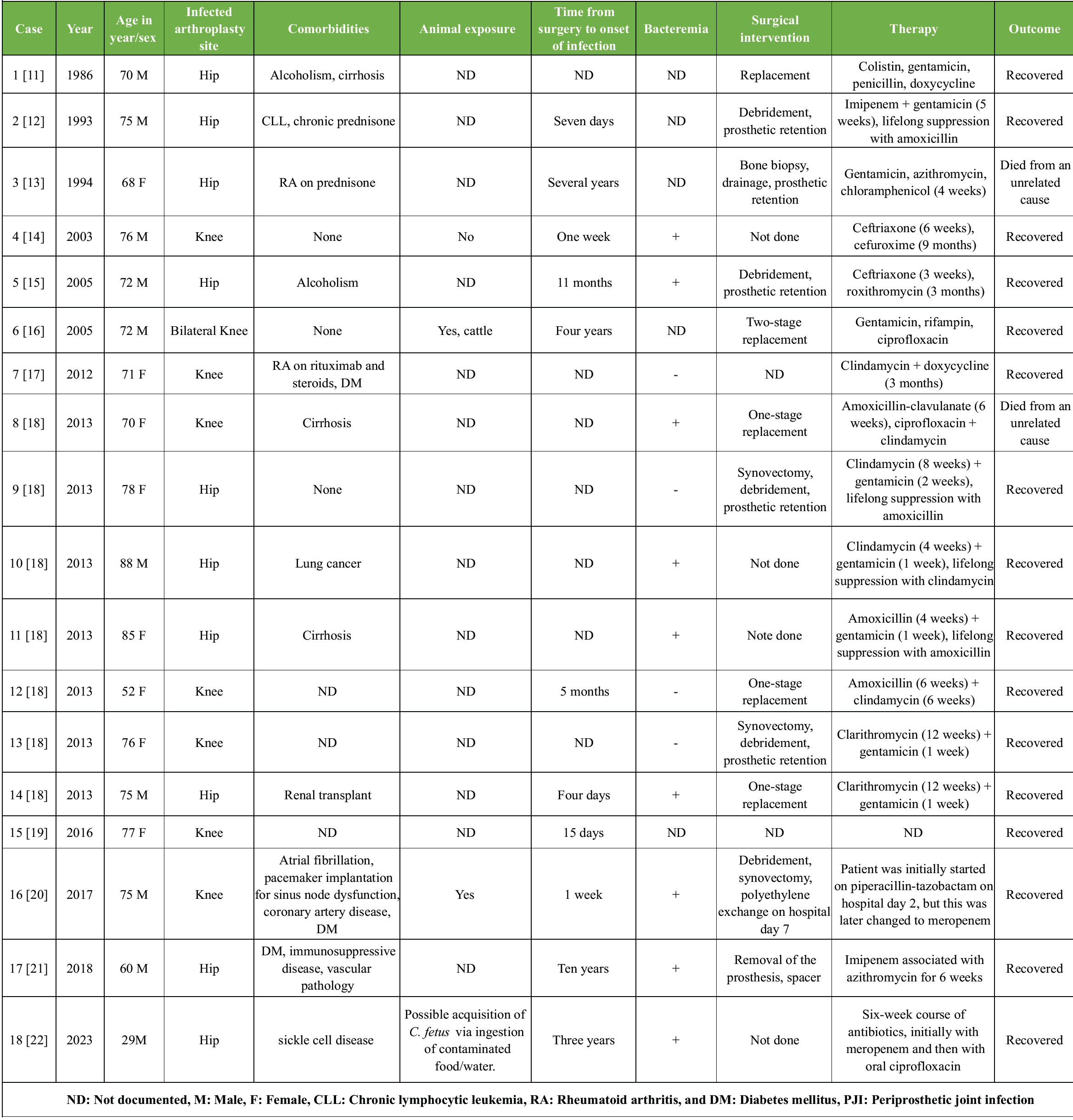 Table 2: Patient demographics, clinical presentations, and treatment outcomes in published cases of Campylobacter fetus PJIs