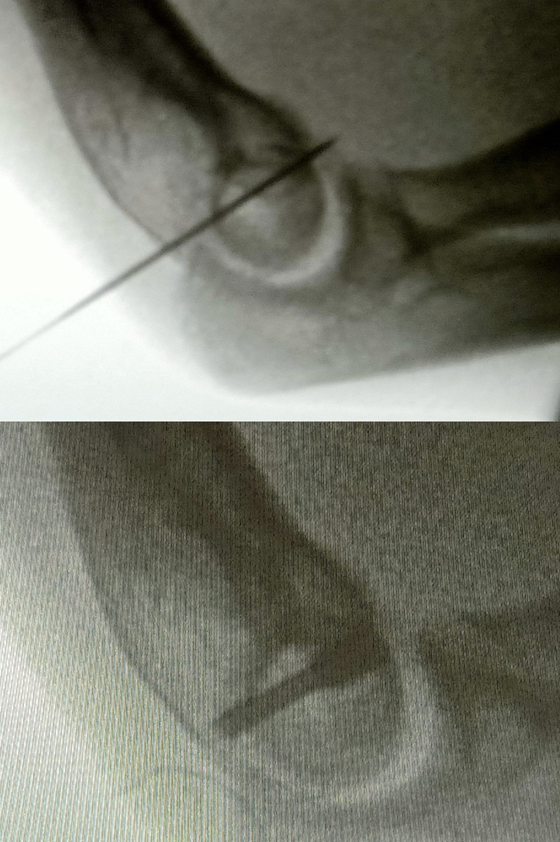 Fracture fragments were anatomically reduced under direct visualization and temporarily stabilized with K-wires and 1 or 2 number of 3.5 mm headless compression screws were inserted in either anterior-to-posterior or posterior-to-anterior direction, depending on the fracture configuration (Fig. 3).