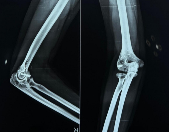 OES results demonstrated a mean pain score of 11.0 ± 2.9 (range, 6–16), function score of 10.9 ± 2.2 (6–15), and social interaction score of 10.7 ± 2.3 (6–15). The mean total OES was 32.6 ± 7.3 (range, 18–46), indicating good elbow function with minimal to no impairment (OES of >32–48). The mean duration of follow-up was 15.8 ± 3.2 months (range: 12–27 months). There were no cases of infection, non-union, implant impingement, or hardware prominence in the study. Results are summarized in Table 1.