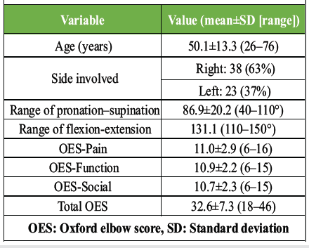 Materials and Methods: The study design was a prospective observational study conducted on 61 patients who were undergoing ORIF through a lateral approach to the elbow, between January 2023 and August 2025, at a tertiary care level 1 trauma center. The Oxford elbow score (OES) was recorded post-surgery, starting at 2 weeks and then at 2-monthly intervals.