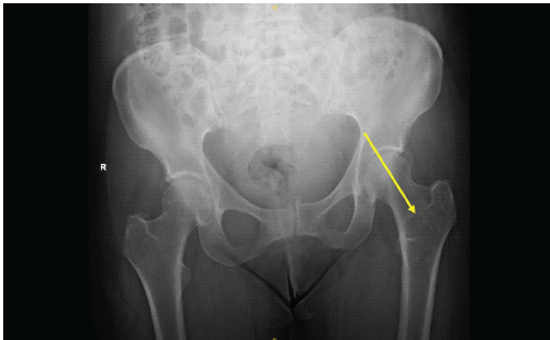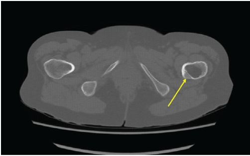 Figure 3: Coronal computed tomography of the pelvis demonstrating an elongated, well-defined intramedullary lucent lesion within the proximal left femoral metaphysis (arrow), with sclerotic margins and no cortical destruction or soft-tissue extension, consistent with a non-aggressive lesion.