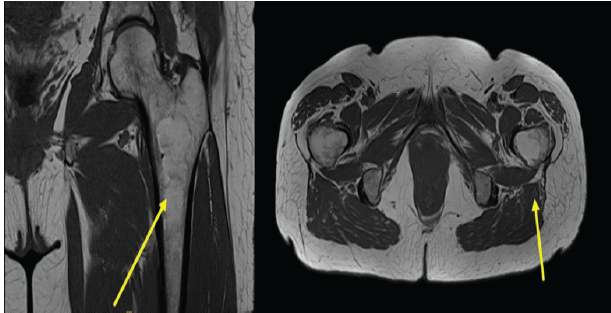 Figure 4: (a) Coronal T1-weighted magnetic resonance imaging (MRI) of the pelvis demonstrating a well-circumscribed intramedullary lesion within the proximal left femur exhibiting homogeneous high signal intensity consistent with fat content (arrow). (b) Axial T1-weighted MRI confirming central intramedullary location with preserved cortical margins and no surrounding marrow edema or soft-tissue extension (arrow).