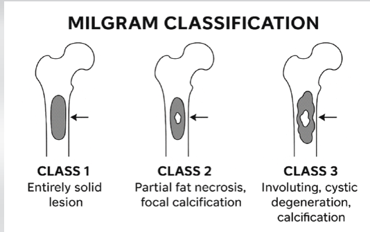 Intramedullary lipomas are benign lesions composed of mature adipocytes within the medullary cavity. According to Milgram’s [1] classification, these tumors are classified into three stages: Stage I lesions consist of viable adipose tissue and appear as homogeneous fat-containing lesions; Stage II lesions demonstrate partial fat necrosis with focal calcification; and Stage III lesions show extensive fat necrosis, cystic change, and sclerosis (Fig. 5). The imaging characteristics in this case are consistent with a Stage I intramedullary lipoma.