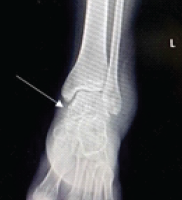 Figure 1: Anteroposterior pelvic radiograph demonstrating a well-defined lucent lesion in the proximal left femoral metaphysis (arrow), with no associated fracture.