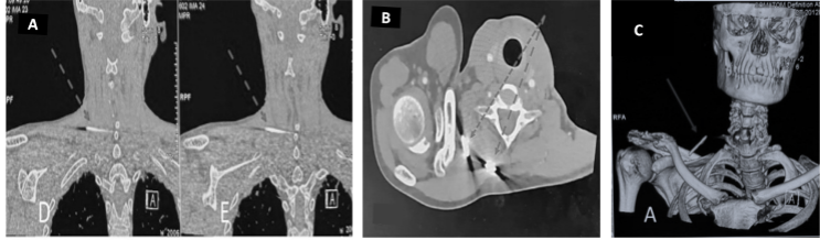 Clinical examination revealed no signs of radiculopathy, motor weakness, or restriction in neck mobility. However, a palpable small swelling (3 × 2 cm) was noted in the right supraclavicular region. The carotid artery was well palpated, and the swelling was lateral to the vascular bundle. Radiographs of the shoulder and neck revealed two broken K-wire fragments – one located in the right supraclavicular region and another posteriorly near the cervical spine (Fig. 1b and c). The shoulder radiograph showed a malunited lateral end clavicle fracture fixed with tension band wiring over two K-wires, both of which were broken distally. A non-contrast computed tomography (CT) scan of the neck was performed to delineate the exact position of the migrated wires (Fig. 2). The case was reviewed in a multidisciplinary team setting with input from an otorhinolaryngology expert. Routine pre-operative laboratory investigations were within normal limits, and the patient was planned for elective hardware removal.