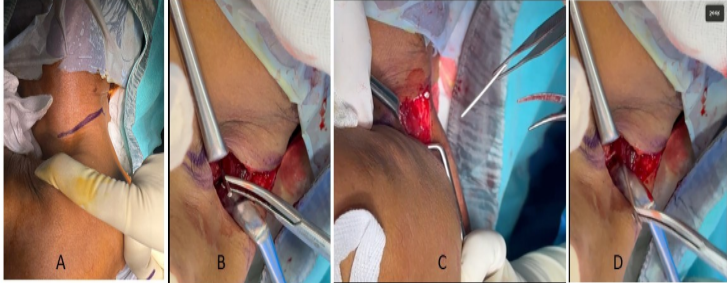 Figure 3: Intraoperative photographs showing the skin incision (a) and retrieval of the two K-wire fragments (b-d).