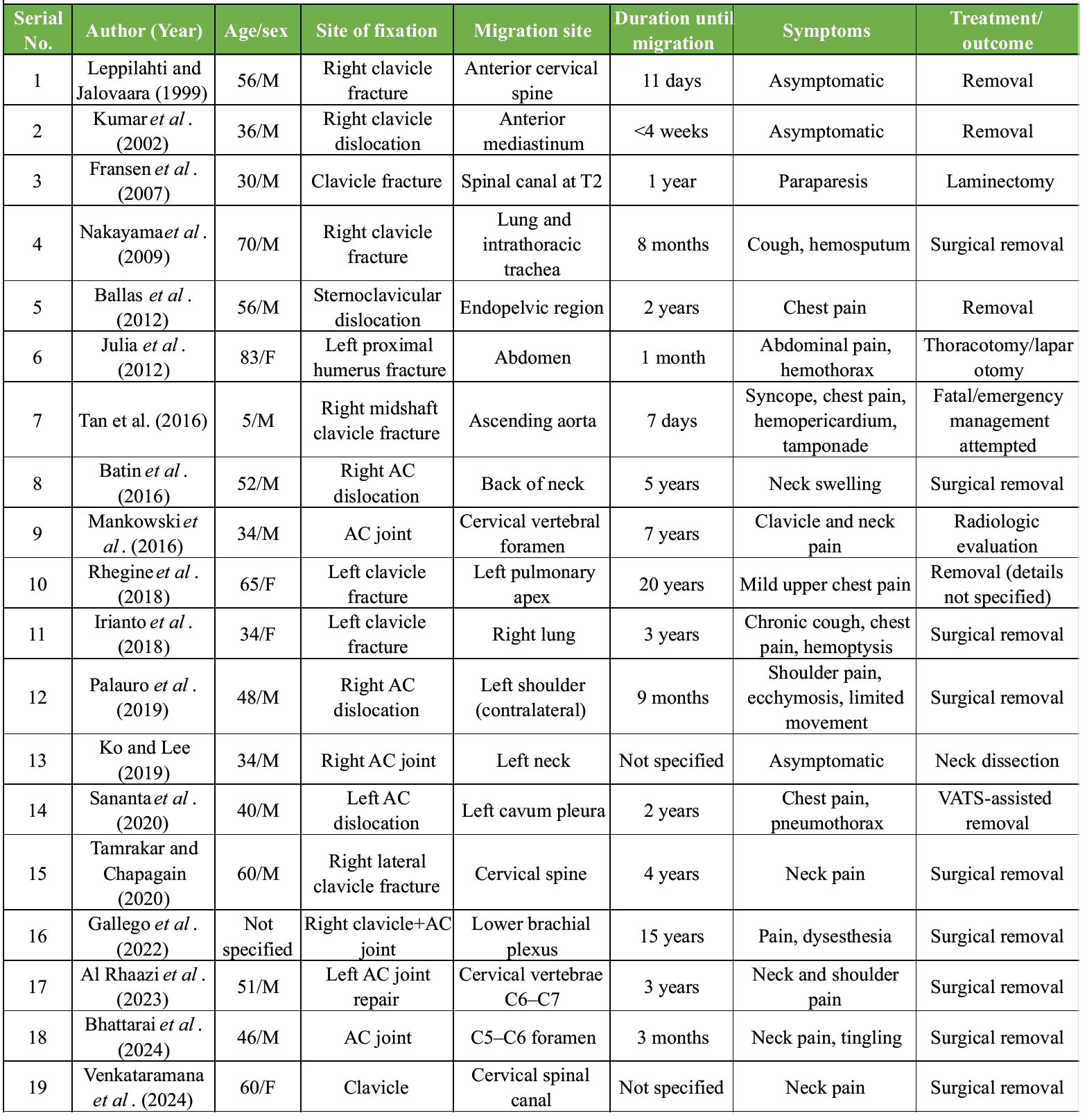 Table 1: Cases of K-wire migration from the clavicle/AC joint/proximal humerus fixation site to neck, thoracic regions, and other distant sites