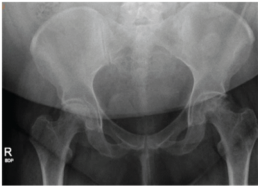 Figure 1: Radiograph of the pelvis of a 37-year-old woman with multifocal osteonecrosis. The image was obtained on August 21, 2024, approximately 2 weeks after core decompression and before total hip arthroplasty. The severity of avascular necrosis was diagnosed at Ficat and Arlet Stage IV bilaterally because of bilateral head collapse.