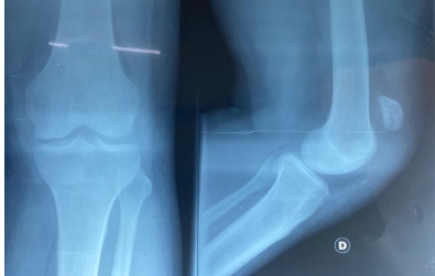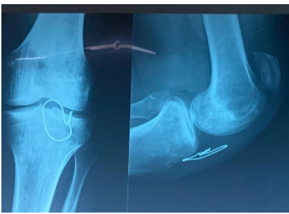 Figure 5: Standard radiograph of the left knee showing patella alta with cerclage wire in place – Patient 3.