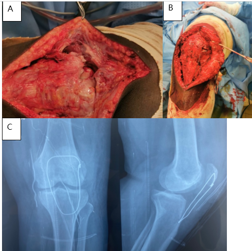 Figure 2: Intraoperative view of the patellar tendon rupture (a), tendon repair (b), and post-operative control radiograph (c) – Patient 1.