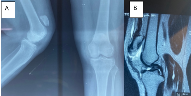 Figure 3: Standard radiograph (A) showing patella alta, and magnetic resonance imaging of the left knee (B) confirming patellar tendon rupture – Patient 2.