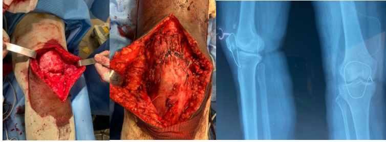 Surgery was performed under spinal anesthesia. Intraoperative findings revealed a proximal rupture of the patellar tendon with quadriceps retraction. Repair required a V-Y lengthening of the quadriceps tendon, reinforced by a protective steel wire frame (Fig. 6). At 3-month follow-up, the patient had regained active knee extension, though quadriceps atrophy persisted. Radiographs showed the patella in an anatomical position over the femoral trochlea.