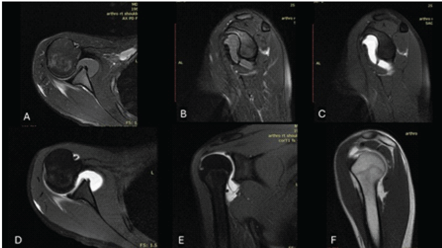 A magnetic resonance imaging (MRI) arthrogram of the right shoulder was performed, revealing (Fig. 1):