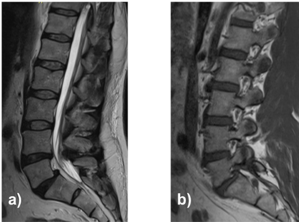 Figure 1: Lumbosacral magnetic resonance imaging: Sagittal T2-weighted (a) and right parasagittal T1-weighted (b).