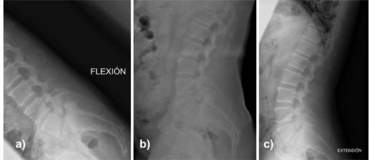 Figure 2: Dynamic lateral lumbar spine radiographs in flexion (a), neutral position (b), and extension (c).