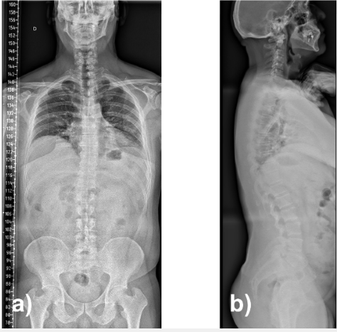 Figure 3: Full-spine radiographs in anteroposterior (a) and lateral (b) projections.