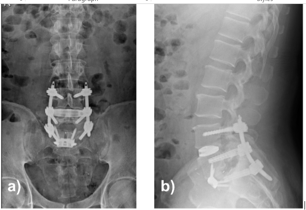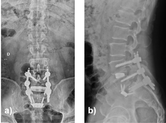 Figure 4: Lumbar spine radiographs in anteroposterior (a) and sagittal (b) projections. Solid fixation and restoration of the sagittal alignment are observed.