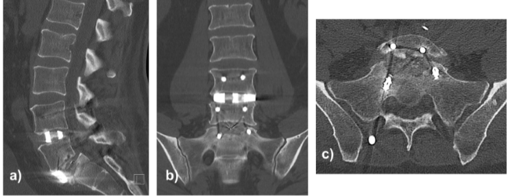Discussion: SIF after circumferential fusion may be precipitated by corticosteroid-associated bone fragility, preexisting pars defects, and increased shear forces across the lumbosacral junction. Early symptoms may mimic post-operative radiculopathy, contributing to delayed diagnosis. CT is the most sensitive modality for early detection. Revision strategies include posterior decompression and reinforcement of fixation; in higher-risk cases, pelvic fixation may be warranted.