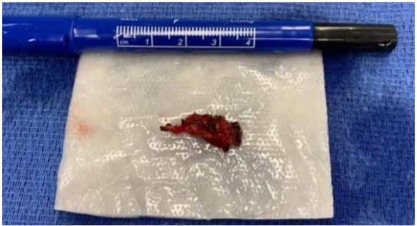 Figure 1: Resected superficial temporal artery pseudoaneurysm measuring approximately 3 cm in length.