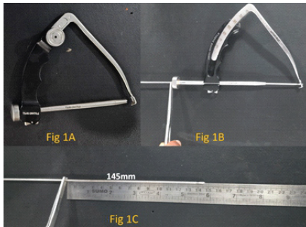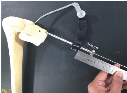 In our case it is 145 mm. Then apply the jig to the bone (in our case tibia) such that the targeting guide arm is at desire point inside the joint and the drill sleeve touches the bone outside and lock it. Now measure the distance between the outermost part of the handle of jig where the drill sleeve is inserted and the inner margin of the stopper of drill sleeve (Fig. 2).