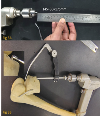 In our case it is 30 mm. Hence, now 145 + 30 = 175 mm will be minimum length of beath pin needed. Mark the 175 mm mark on the beath pin and attach the drill at 175 mm mark (Fig. 3a). Hence, now you can safely drill till the chuck of the drill touches the stopper of drill sleeve and you will find the beath pin has just exited at the desire point marked by targeting guide and cannot go beyond that (Fig. 3b).