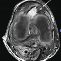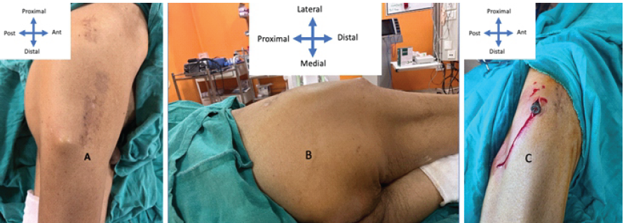 Figure 5: Clinical picture at 2 months presentation (a), bony hard swelling at the lateral proximal thigh (b), Uncoupled component (c).