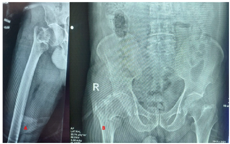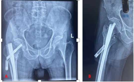 He underwent closed reduction and an intramedullary nail fixation under spinal anesthesia. An anatomical reduction was achieved, and a long PFNA was inserted without any difficulty (size – 10 × 400 mm with a 95 mm helical blade and 2 distal interlocks of size 46 and 52 mm).