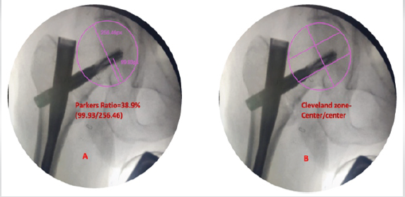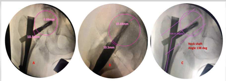 Figure 2: Intraoperative assessment of tip apex distance (TAD) (a) in anterior posterior 9.09 mm, 10.64 mm in lateral view (b), and total TAD = 19.73 mm (c) neck shaft angle 138°s.