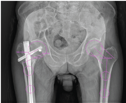 The post-operative fracture gap was <1 mm, and Garden alignment index was good, and the center of the helical blade was placed in the Cleveland zone center–center. The reduction quality was good according to the Baumgaertner reduction quality criteria, and excellent according to the Chang reduction quality criteria, respectively.