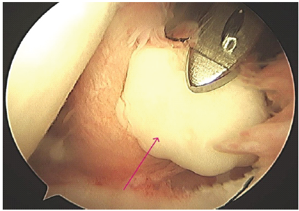 Figure 2: Arthroscopic view from the standard portal: Showing a pearly white cartilaginous loose body (arrow marked). The inflamed and hypertrophic synovium is clearly visible. The articular cartilage of the humeral head appears intact in this field of view.