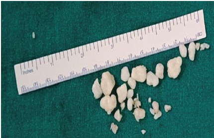 Figure 3: Excised loose bodies: Numerous loose bodies after arthroscopic removal.